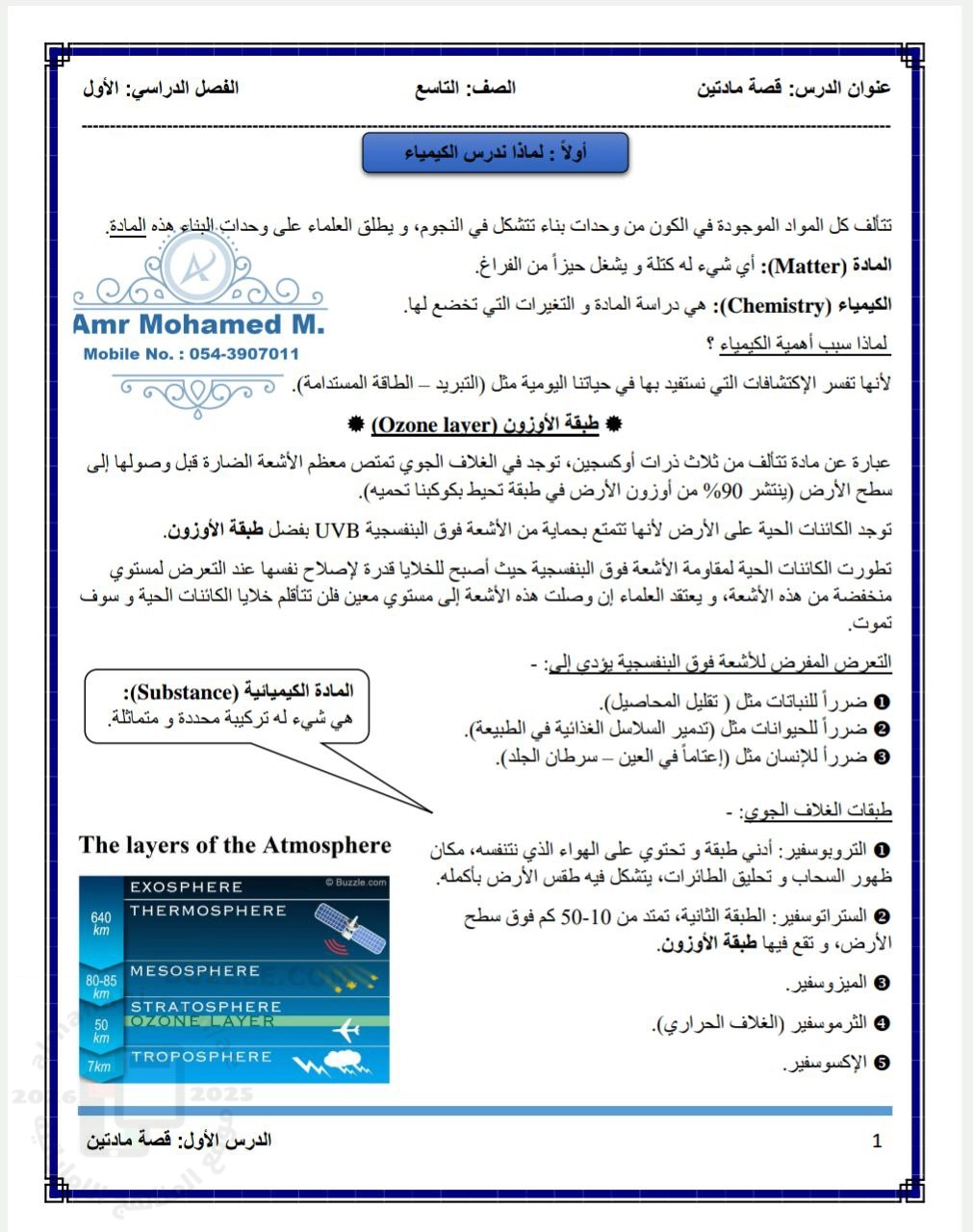 معلومات الملف: ملخص درس لماذا ندرس الكيمياء من وحدة قصة مادتين يتعرف الطالب أهمية الكيمياء يتعرف طبقات الجو و طبقة الأوزون أضرار الأشعة فوق البنفسجية | ||