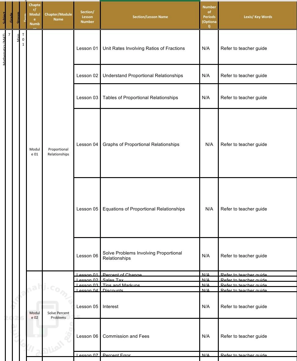 4. الصف السابع, رياضيات, الخطة الفصلية الدرسية للمقرر منهج ريفيل