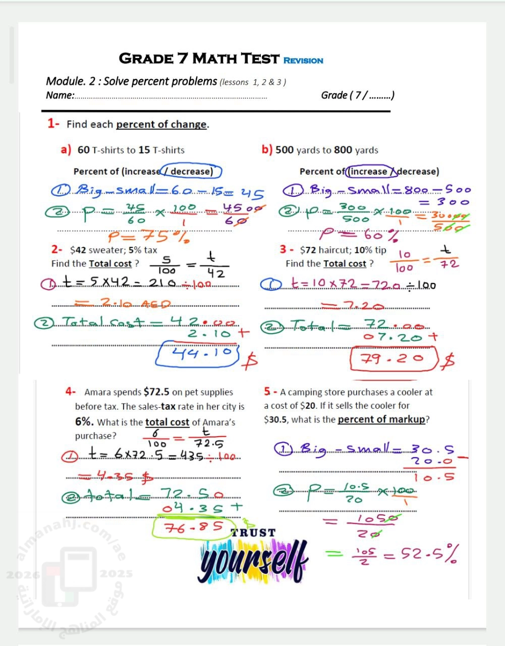 2. الصف السابع, رياضيات, حل اختبار الدروس الثلاثة الأولى من الوحدة الثانية منهج ريفيل