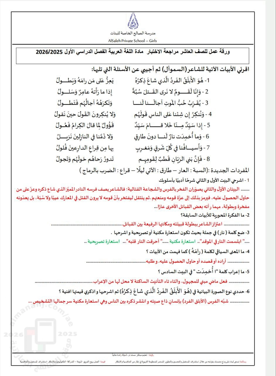 معلومات الملف: حل أوراق عمل مراجعة اختبار نص شعري للسموأل يتمكن الطالب من شرح الأبيات يتمكن من تحديد الفكرة المحورية للأبيات يتعرف الاستعارة المكنية و الاستعارة التصريحية يحدد نوع الصورة البيانية | ||