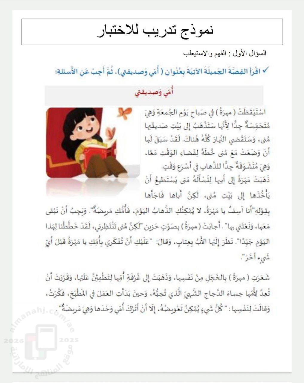 معلومات الملف: نموذج تدريب للاختبار بدون الحل نواتج التعلم : الفهم و الاستيعاب يتمكن الطالب من فهم النص المقروء و الإجابة عن الأسئلة المتعلقة بهذا النص بنية اللغة يتعرف الطالب اسم انسان و اسم حيوان و اسم نبات و اسم مكان الكتابة يتمكن الطالب من كتابة تنوين الفتح و الضم و الكسر لبعض الكلمات | ||