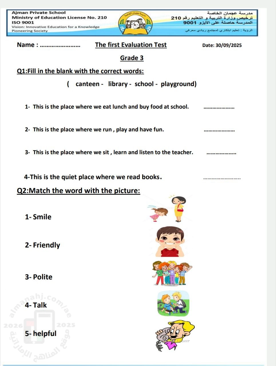 أسئلة The first evaluation test اختبار التقويم الأول - إعداد: مدرسة عجمان الخاصة | ||