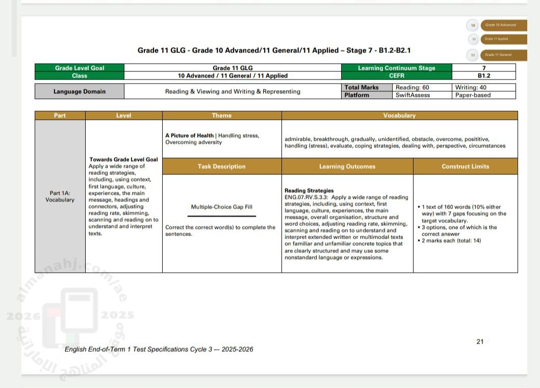 معلومات الملف: مواصفات الاختبار النهائي للفصل الأول ( الهيكل الوزاري ) للصف العاشر المتقدم | ||