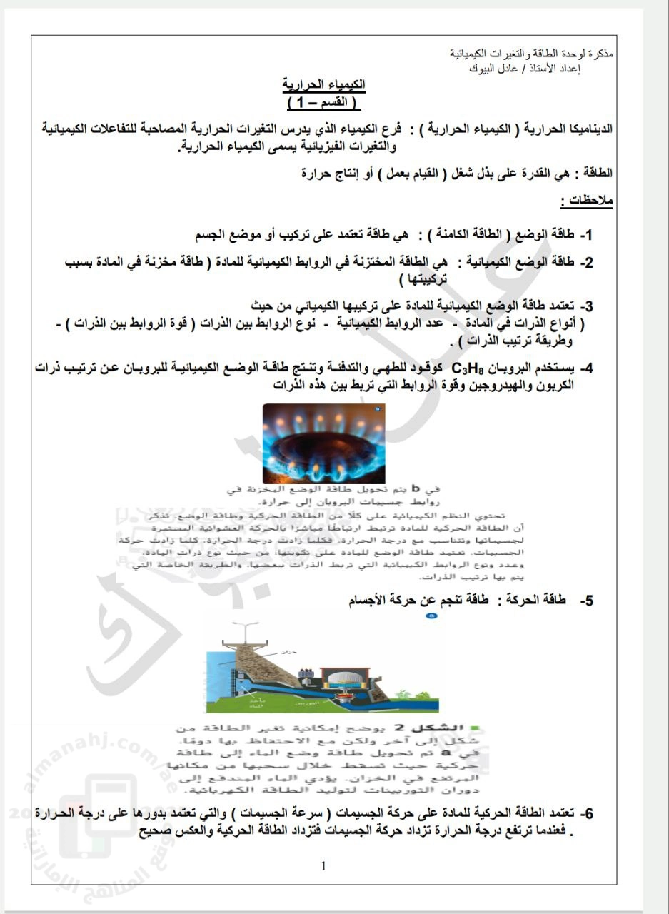 | مذكرة للوحدة الأولى الطاقة والتغيرات الكيميائية مع تطبيقات - إعداد: عادل البيوك | ||