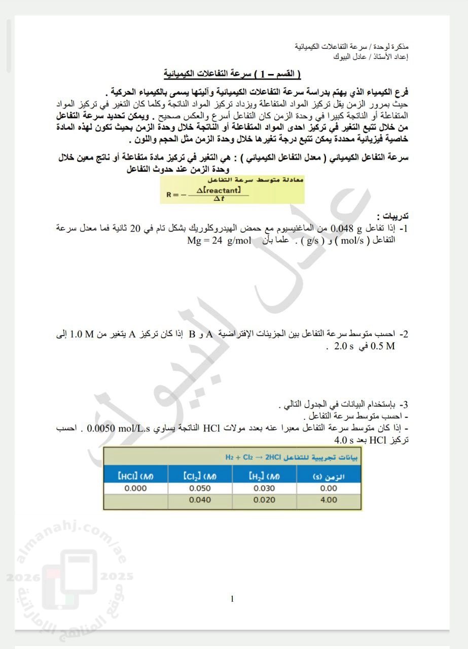 | مذكرة للوحدة الثانية سرعة التفاعلات الكيميائية مع تطبيقات - إعداد: عادل البيوك | ||