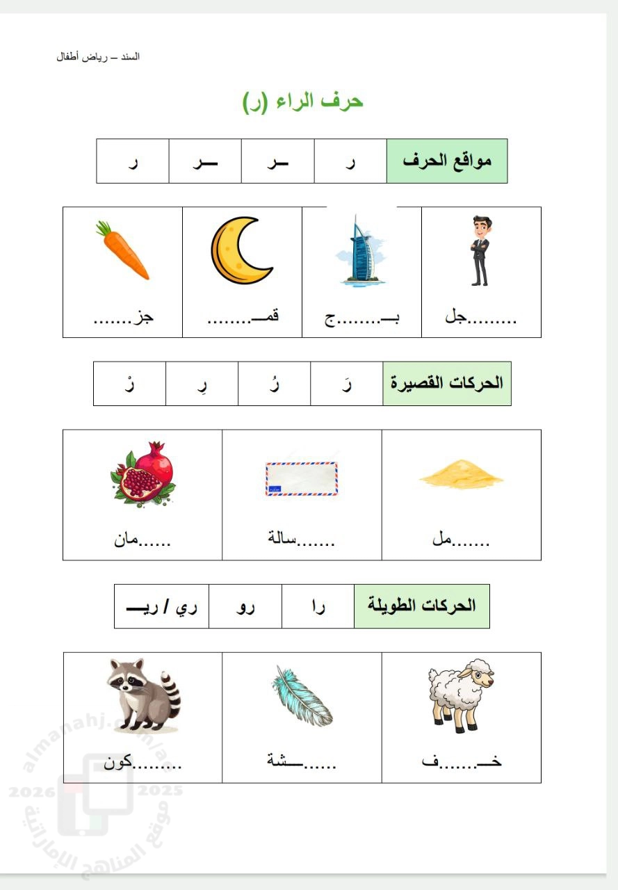 | أوراق عمل مواقع حرف الراء مع الحركات القصيرة والطويلة | ||