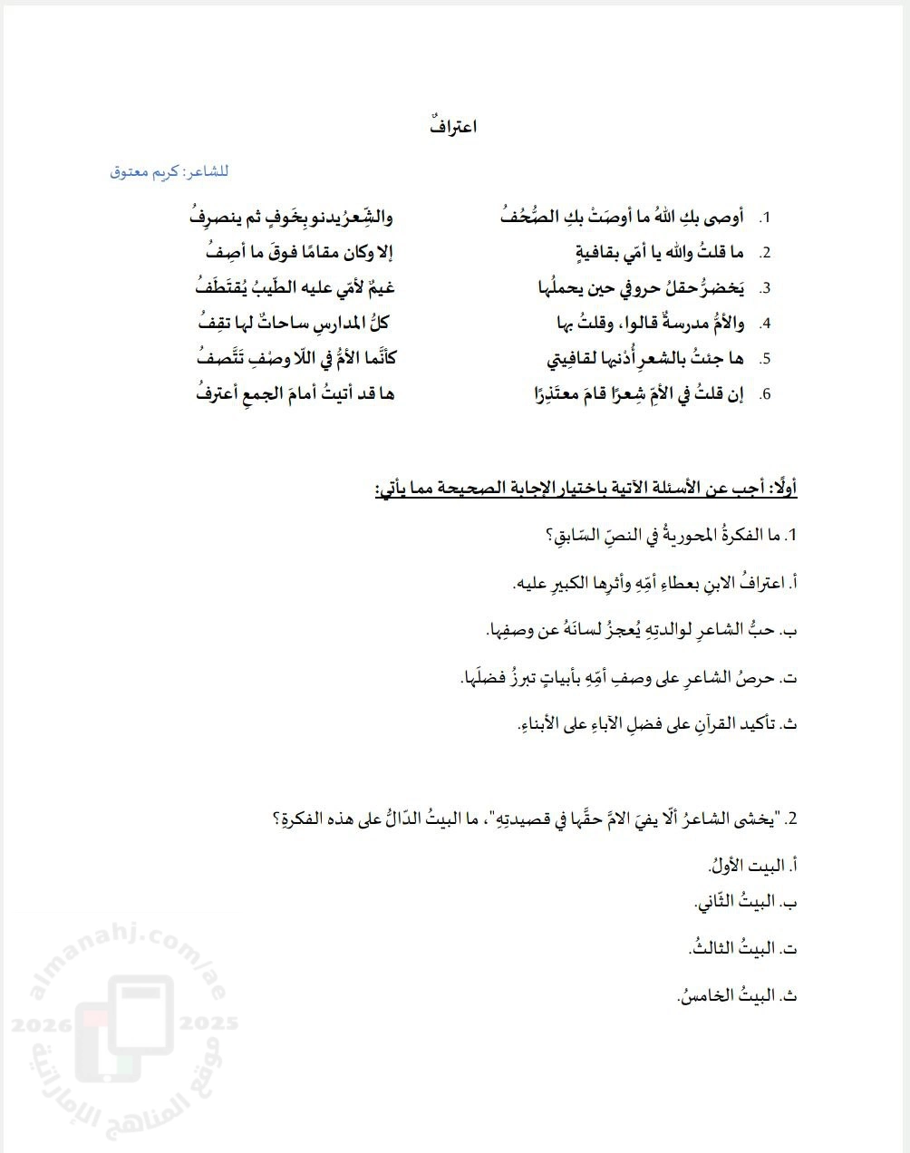 ورقة عمل إثرائية قصيدة اعتراف للشاعر كريم معتوق | ||