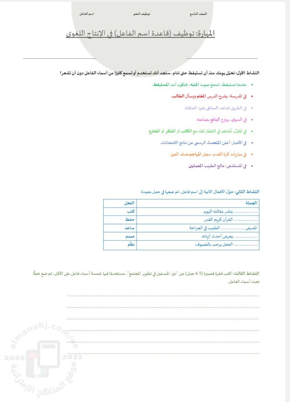 تم إيجاد الملف: ورقة عمل توظيف قاعدة اسم الفاعل في الإنتاج اللغوي