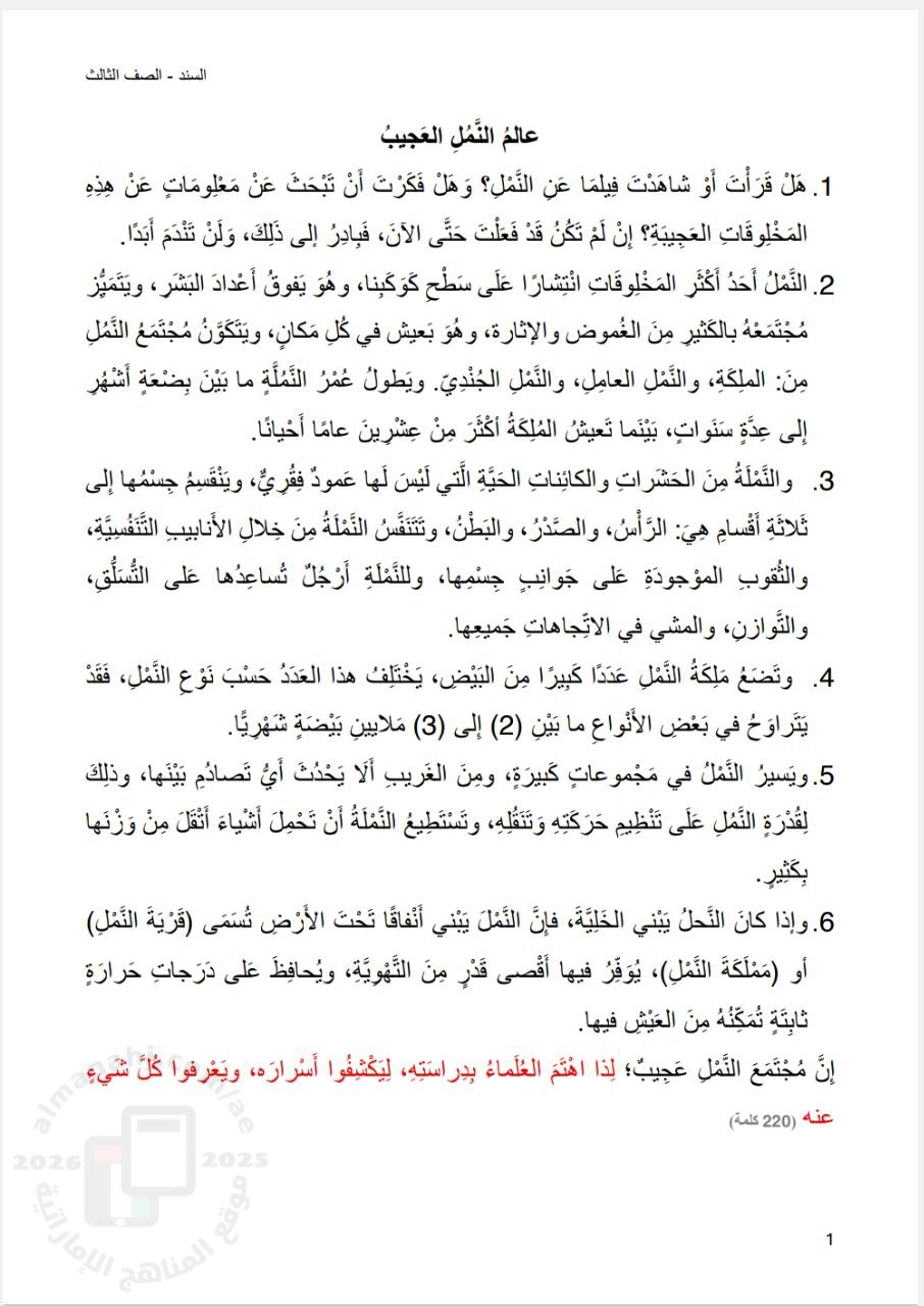 معلومات الملف: أسئلة اختبار فهم المقروء النص المعلوماتي - نص عالم النمل العجيب - بدون الحل