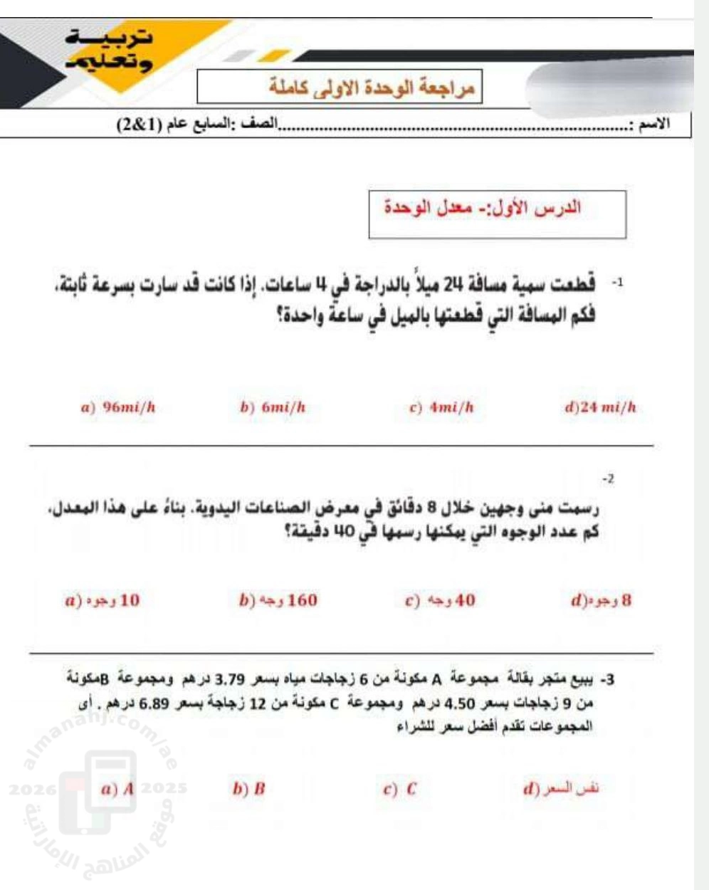 معلومات الملف: مراجعة جميع دروس الوحدة الأولى النسب و الاستدلال التناسبي