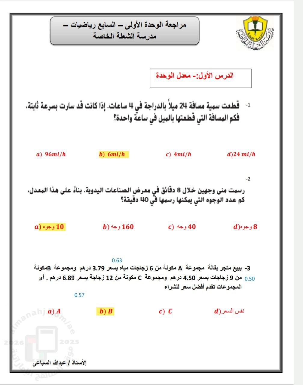 حل مراجعة جميع دروس الوحدة الأولى النسب والاستدلال التناسبي - إعداد: عبد الله السباعي | ||