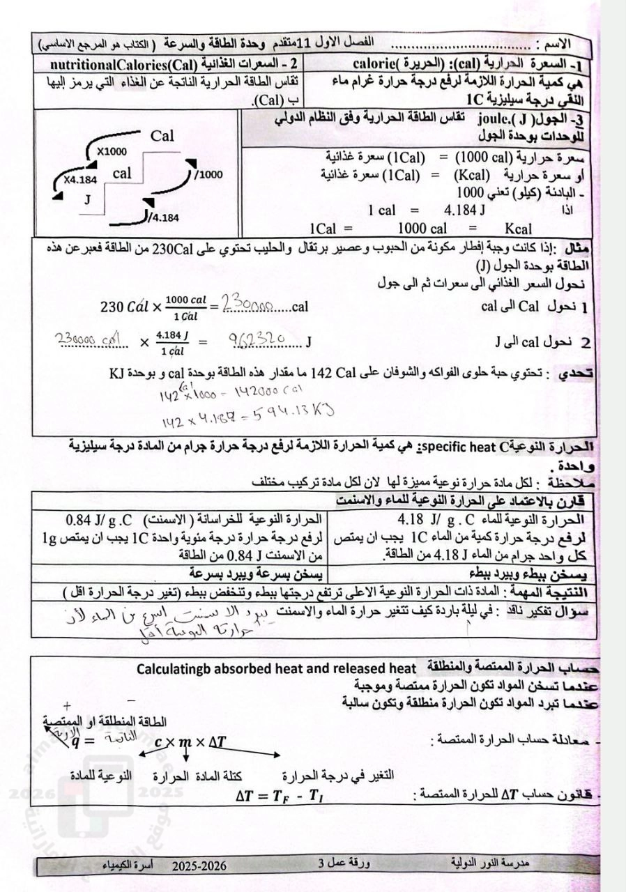 حل ملزمة الوحدة الأولى الطاقة والسرعة - إعداد: مدرسة النور الدولية | |||