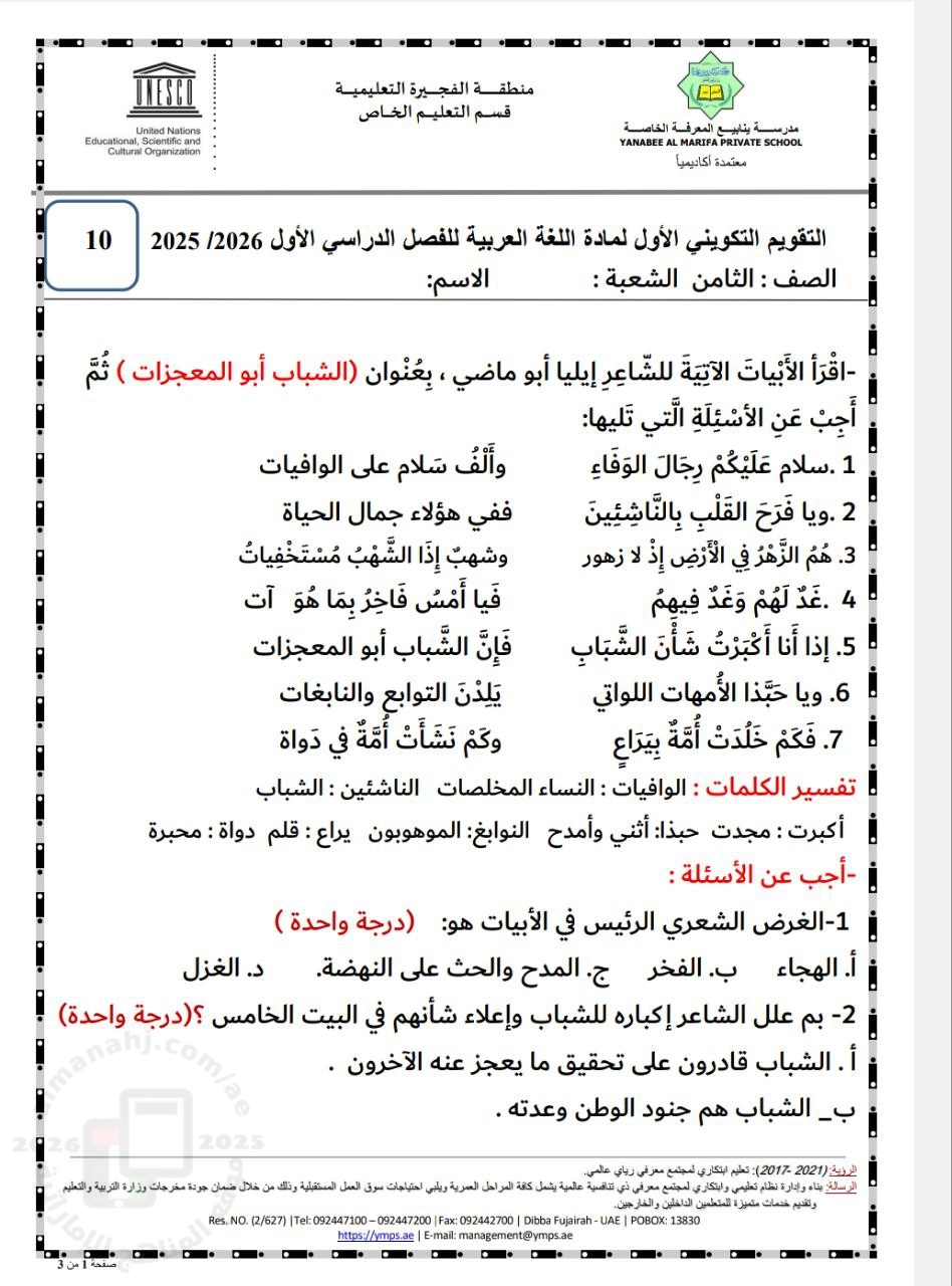 أهلاً بكم جميعاً طلاباً ومدرسين وأهالي طلبة ومهتمين، في قسم دولة الإمارات ، نحن الآن في الفصل الأول من العام الدراسي 2025/2026 وتاريخ اليوم 2025/10/06 م | |