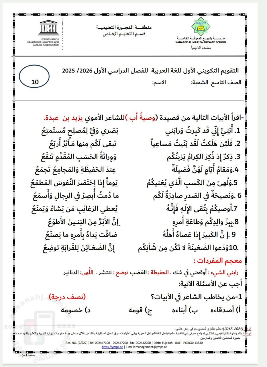 أهلاً بكم جميعاً طلاباً ومدرسين وأهالي طلبة ومهتمين، في قسم دولة الإمارات ، نحن الآن في الفصل الأول من العام الدراسي 2025/2026 وتاريخ اليوم 2025/10/06 م | |