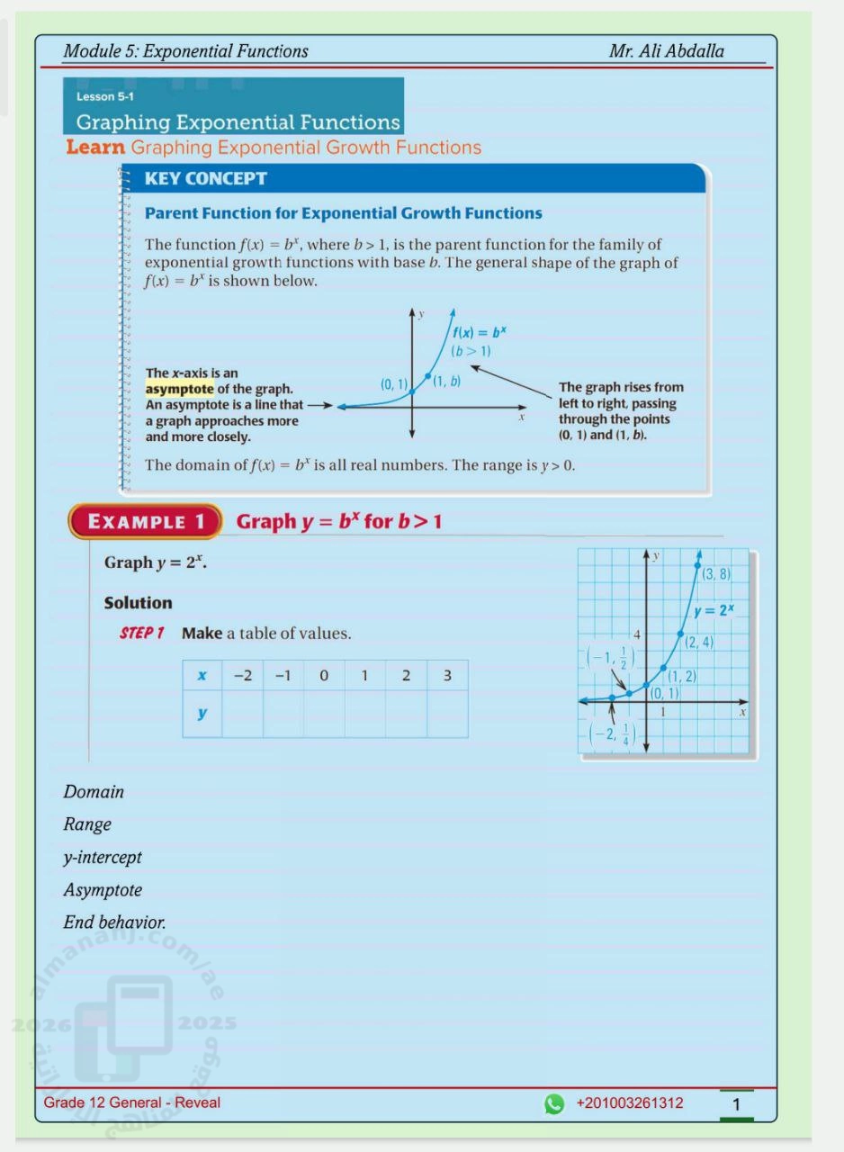 1. رياضيات, الفصل الأول, 2025-2026, أوراق عمل مراجعة الوحدة الخامسة Exponential functions الدوال الأسية منهج ريفيل