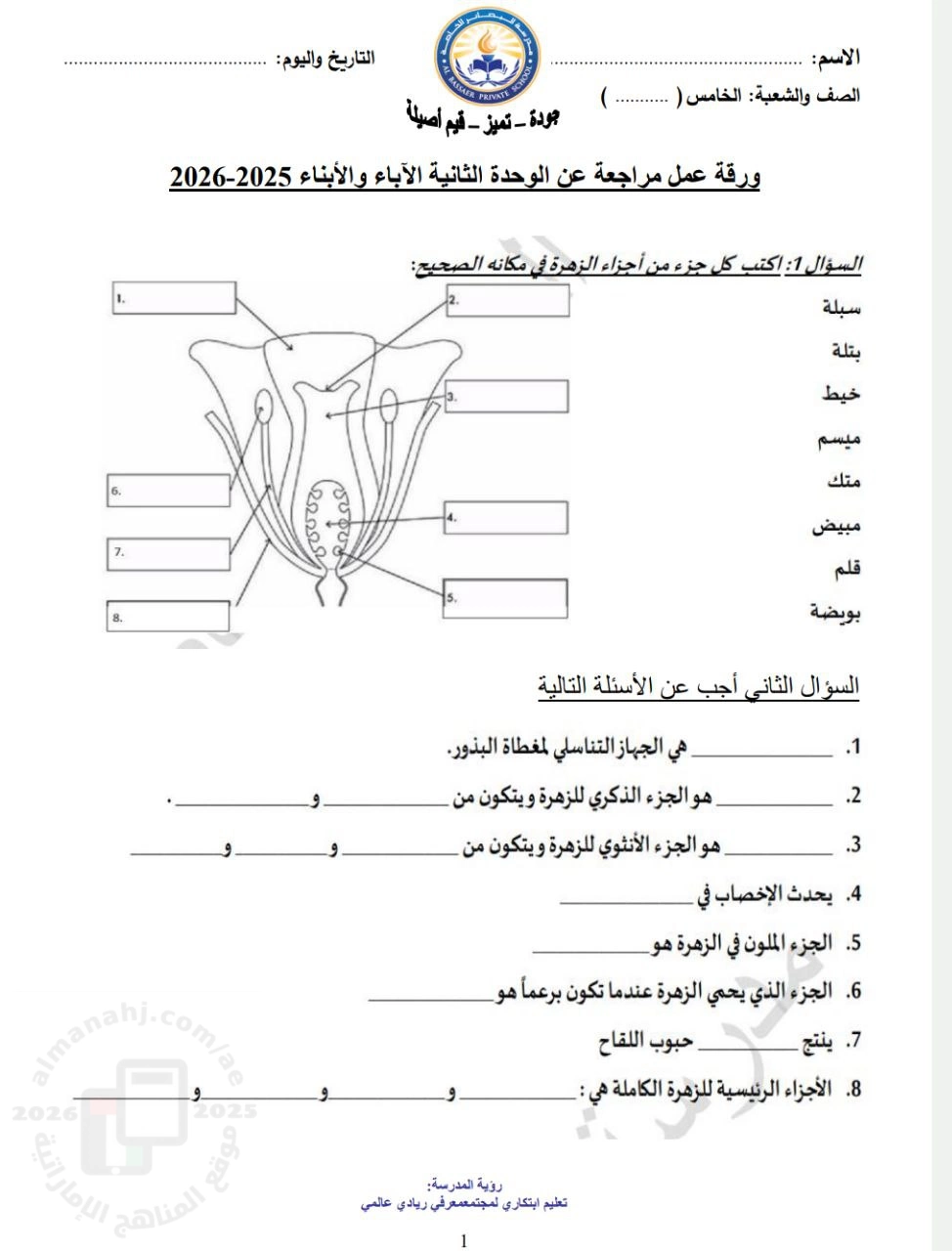 أوراق عمل الوحدة الثانية الآباء والأبناء (استعداد للتقويم الثاني) - إعداد: مدرسة البصائر الخاصة | ||