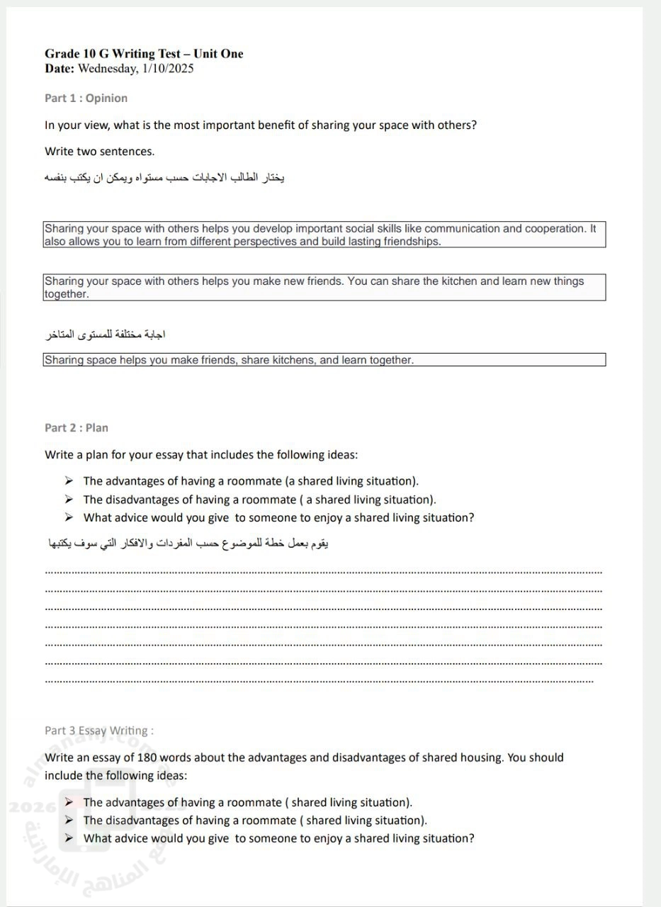 اختبار كتابي Writing test في الوحدة الأولى متبوع بالحل المسار العام | ||