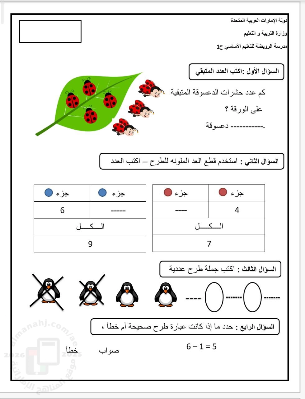 معلومات الملف: أوراق عمل درس مفاهيم الطرح بدون الحل