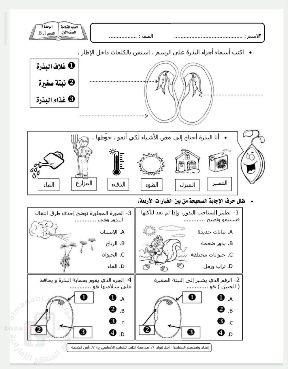 أوراق عمل مراجعة الوحدة الثالثة النباتات تنمو وتتغير - إعداد: أمل ليواد | ||