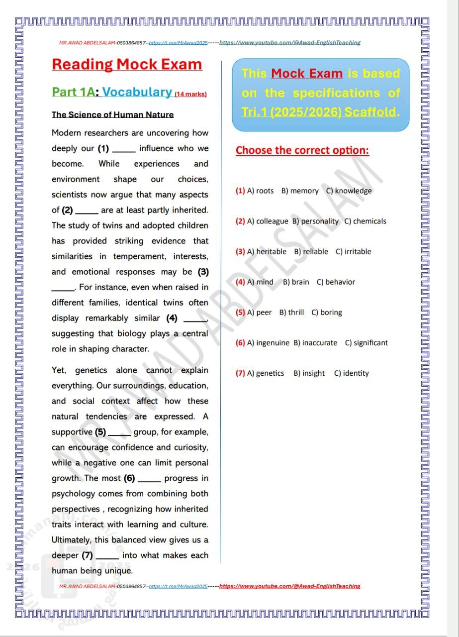 معلومات الملف: أسئلة اختبار تدريبي Mock exam وفق الهيكل الوزاري بدون الحل