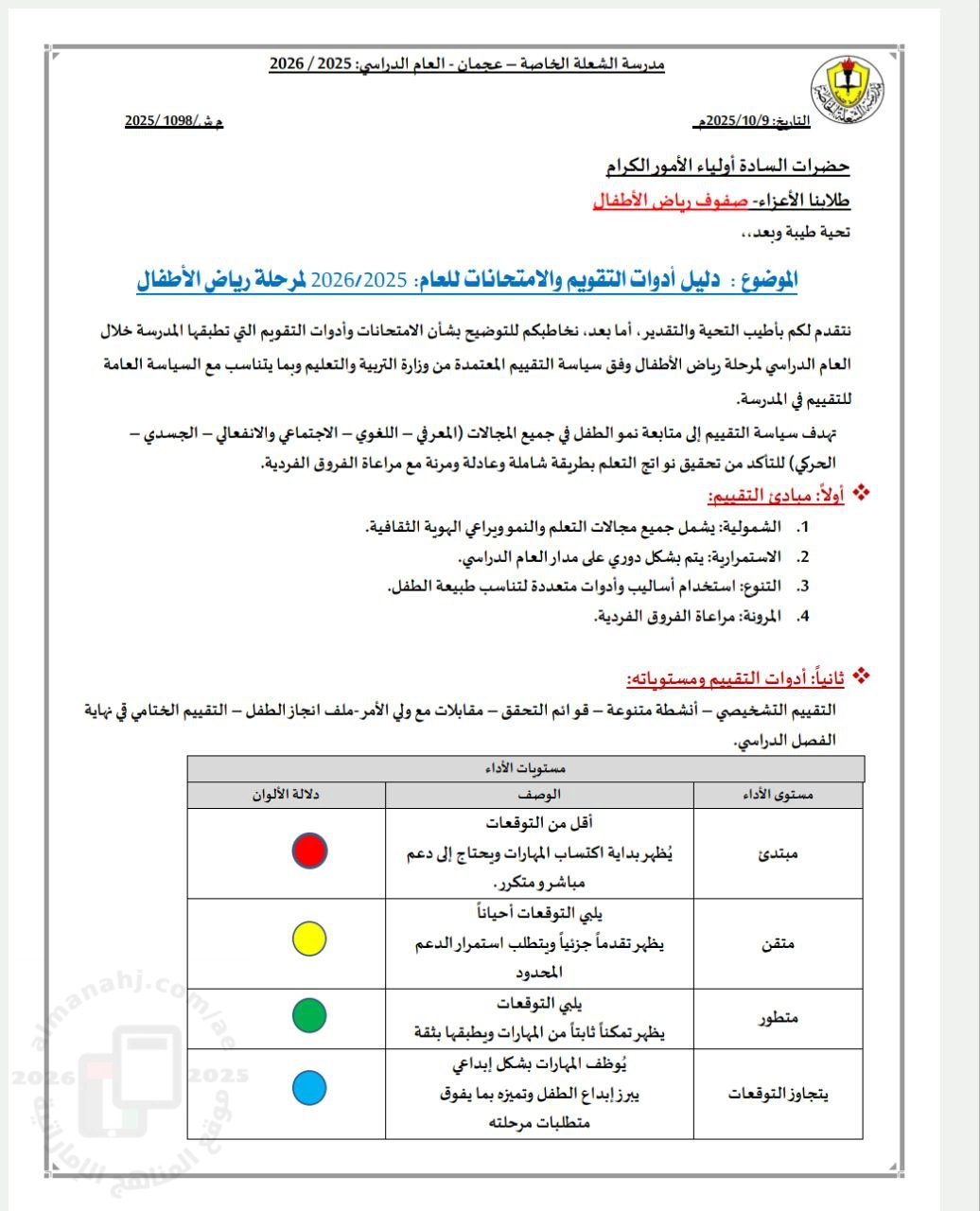 تم إيجاد الملف: دليل أدوات التقويم والامتحانات للعام 2026-2025 لمرحلة رياض الأطفال