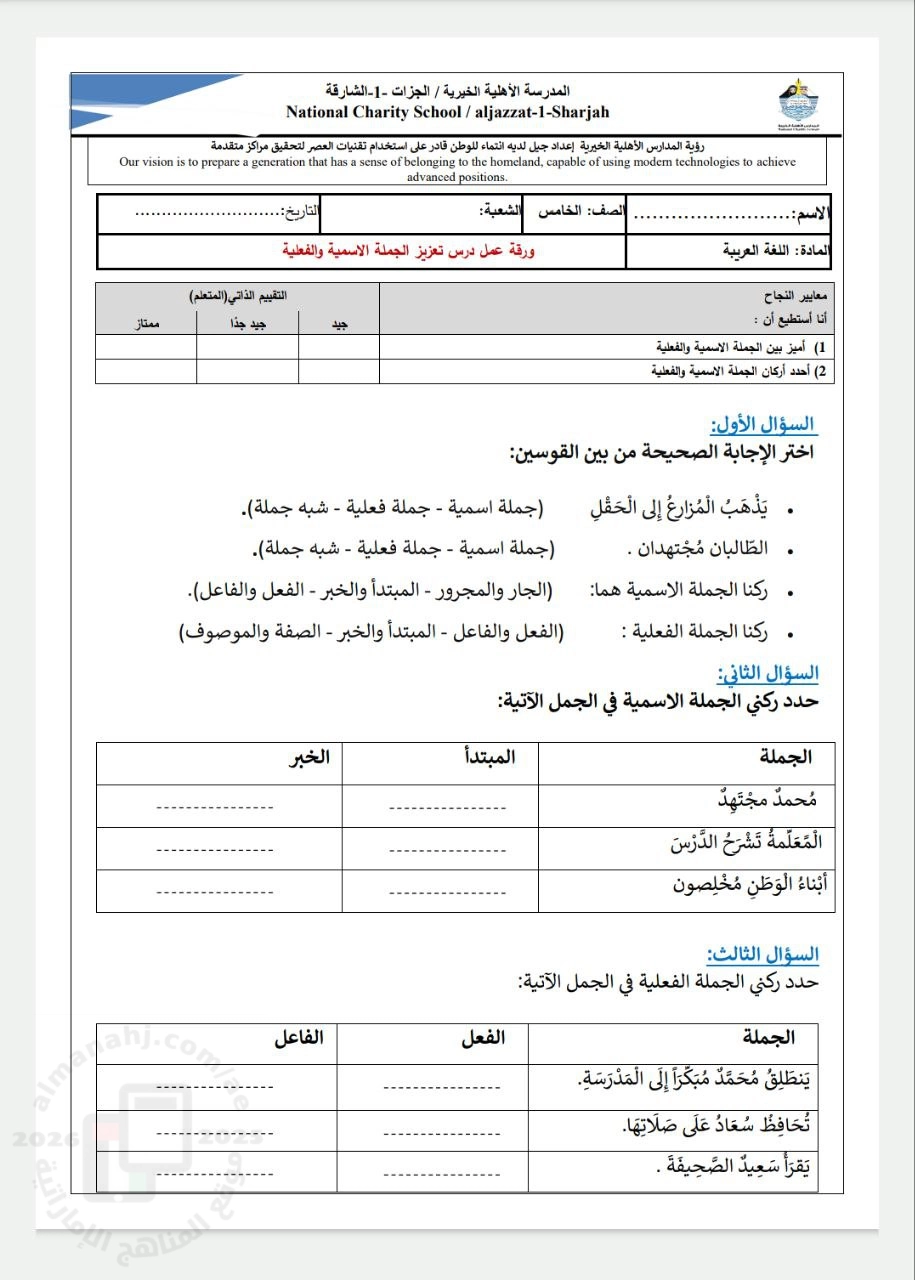 ورقة عمل درس تعزيز الجملة الاسمية والجملة الفعلية - إعداد: المدرسة الأهلية الخيرية | ||