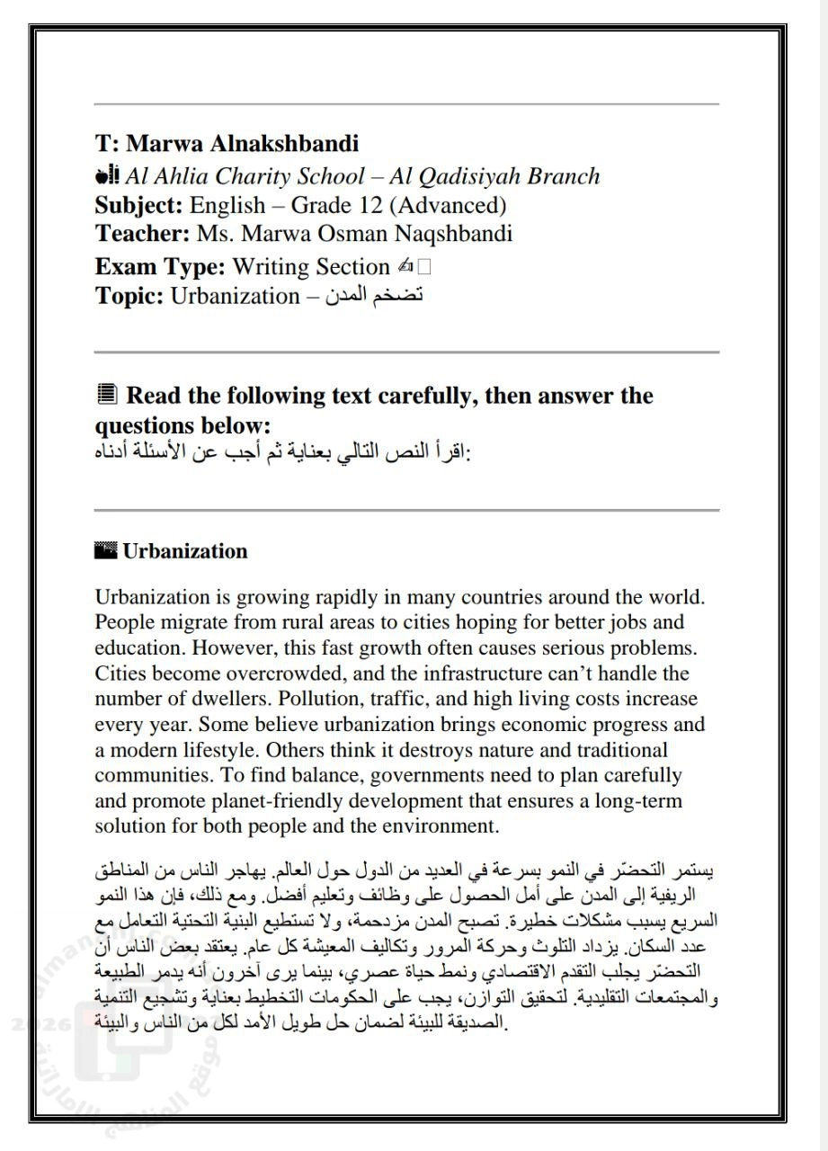 أسئلة اختبار كتابي Urbanization تضخم المدن المسار المتقدم - إعداد: Marwa Alnakshbandi | ||