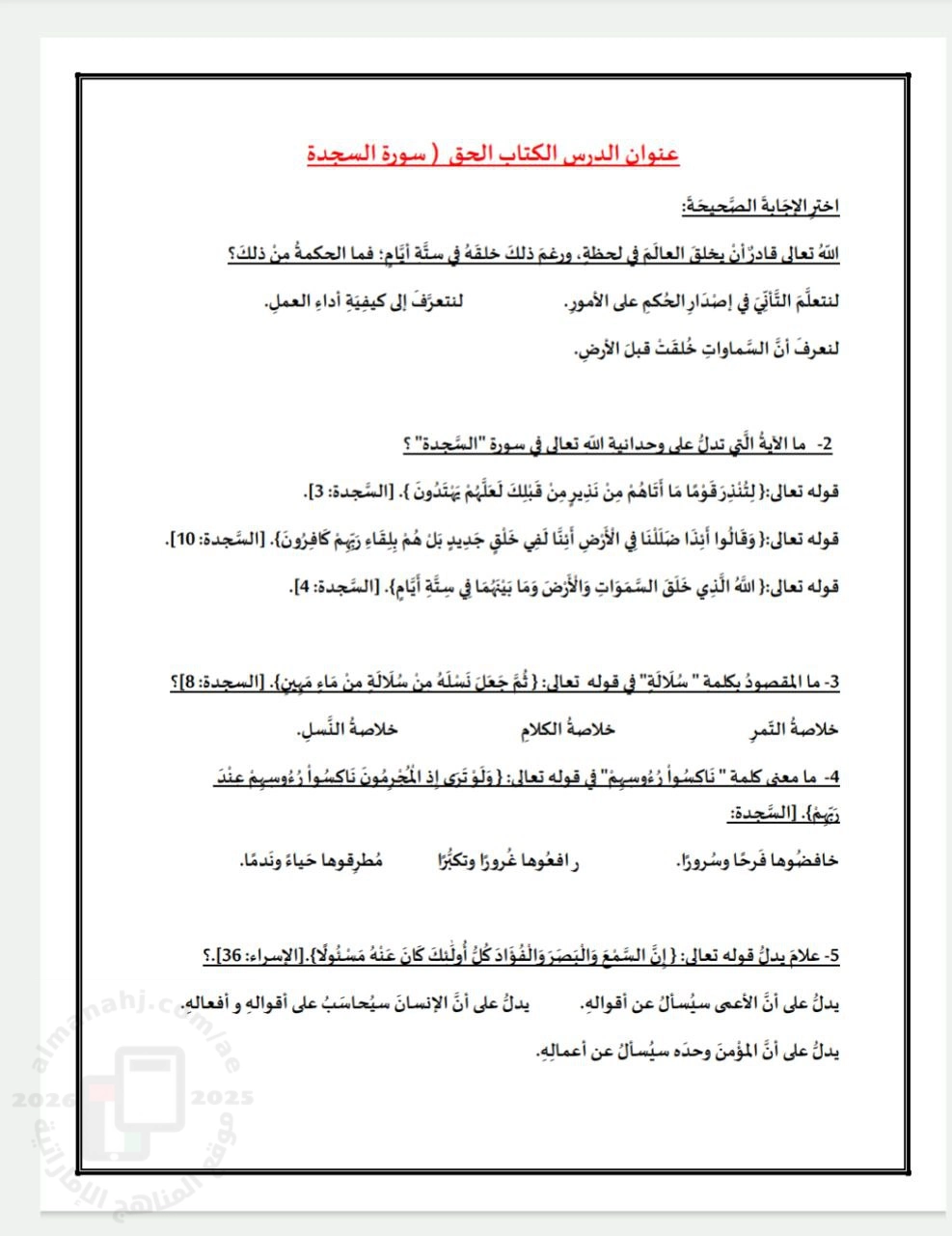 معلومات الملف: الملف عبارة عن مذكرة تعليمية للوحدة الأولى، تتضمن مجموعة من الدروس الدينية والتربوية مع أسئلة اختيار من متعدد. تغطي المذكرة مواضيع مثل تفسير سورة السجدة، وصايا الرسول ﷺ، العمل التطوعي ، حرمة المسلم، فرائض الصلاة ، ودور الإمارات في خدمة العالم. | ||