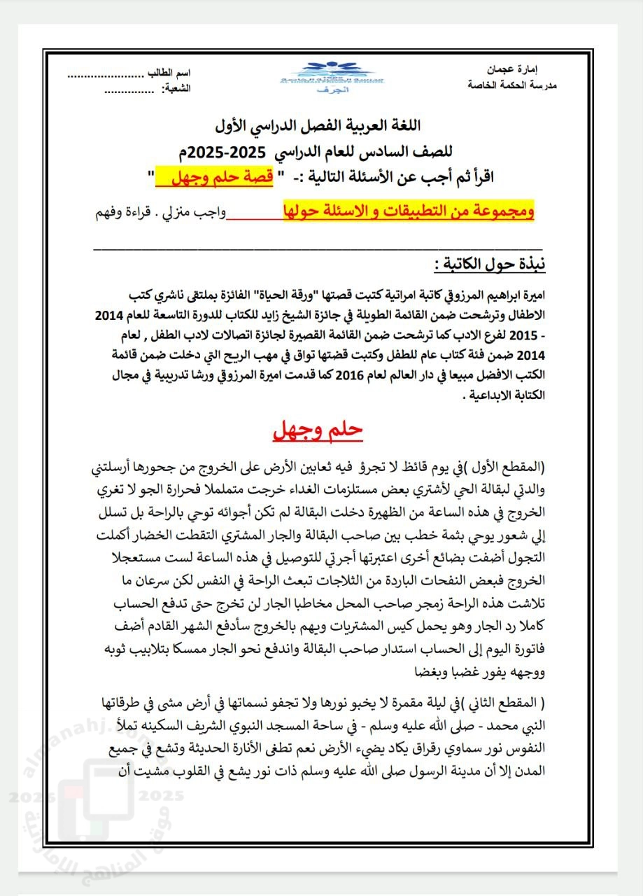 معلومات الملف: تدريبات تطبيقية على قصة حلم و جهل مع الإجابات | ||