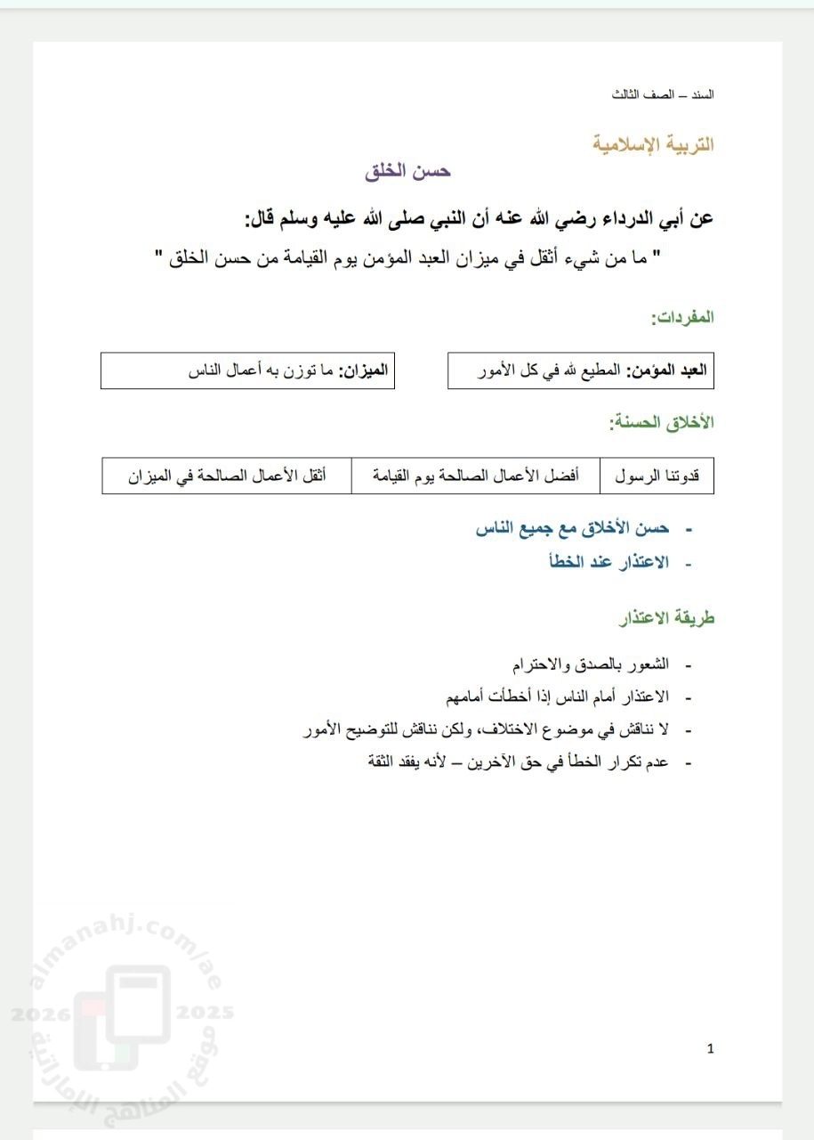 تم إيجاد الملف: ملخص وأوراق عمل درس حسن الخلق