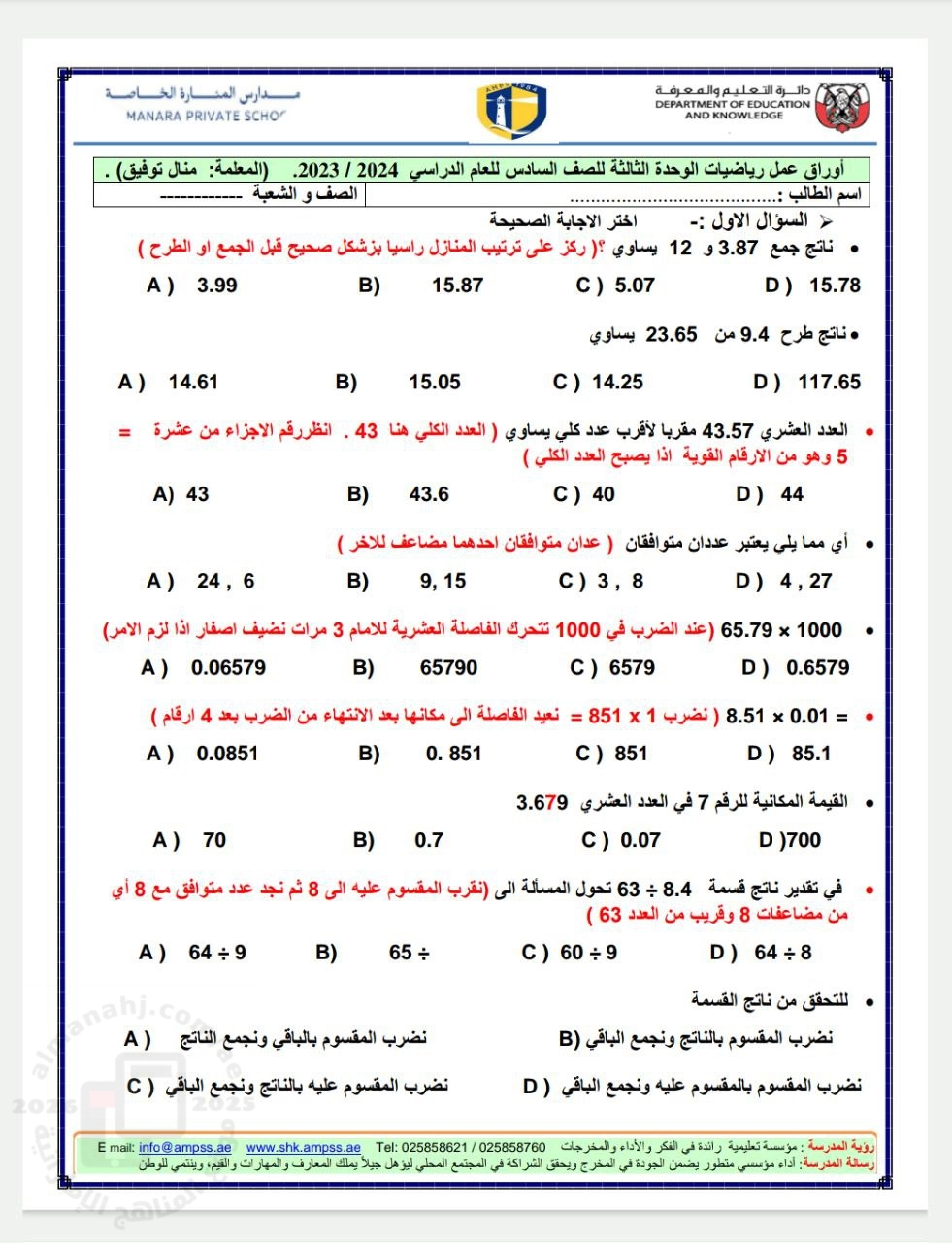 أنت هنا: موقع المناهج ⇦ المناهج الإماراتية ⇦ الصف السادس ⇦ رياضيات ⇦ الفصل الأول ⇦ أوراق عمل |