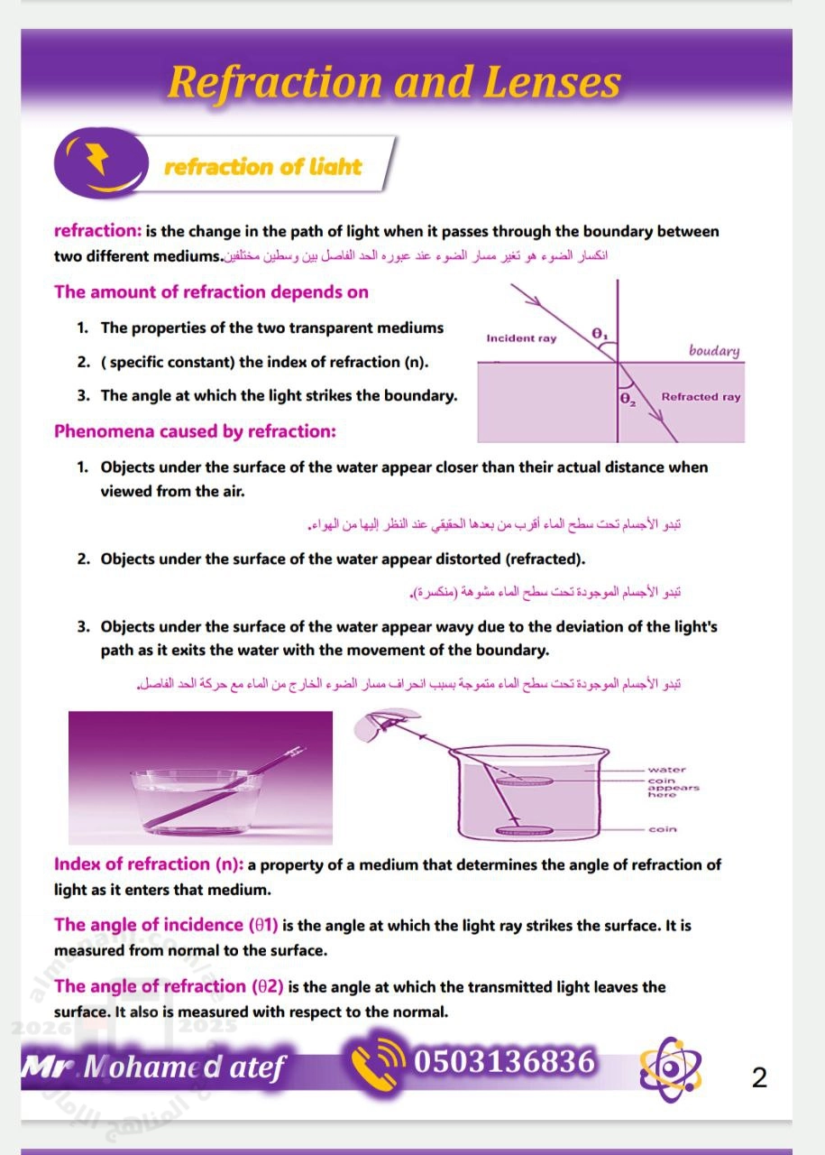 1. الصف العاشر المتقدم, فيزياء, مذكرة الوحدة الثالثة refraction and lens منهج انسباير