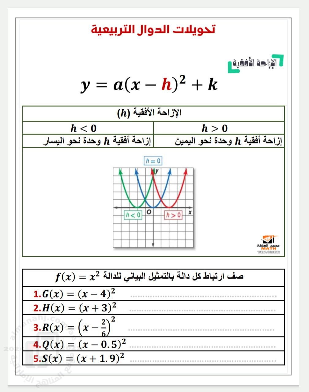 أوراق عمل مراجعة الدرس السابع تحويلات الدوال التربيعية من الوحدة الأولى - إعداد: محمد العقلة | ||
