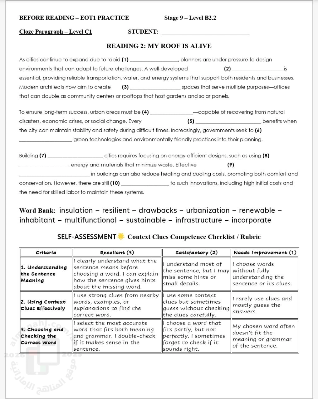 تم إيجاد الملف: اختبار تدريبي قراءة Reading: My roof is alive متبوع بالإجابات