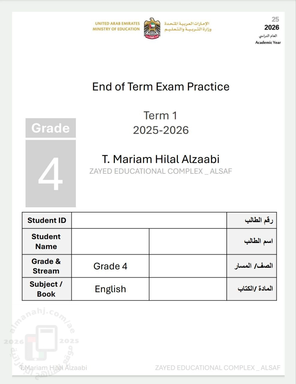 معلومات الملف: اختبار تجريبي نهاية الفصل الأول وفق الهيكل الوزاري الجديد للعام 2025-2026 بدون الحل