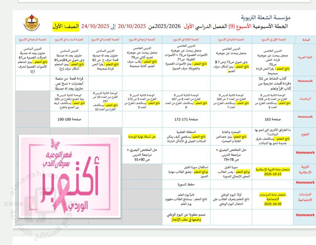 معلومات الملف: فيما يلي نسخة من الخطط الأسبوعية لطلابنا الأعزاء وأولياء أمورهم الكرام، للصفوف من ( الروضة حتى الثاني عشر ) الأسبوع التاسع من الفصل الدراسي الأول من الأثنين 20-10-2025 حتى الجمعة 24-10-2025 من مدرسة الشعلة الخاصة | ||