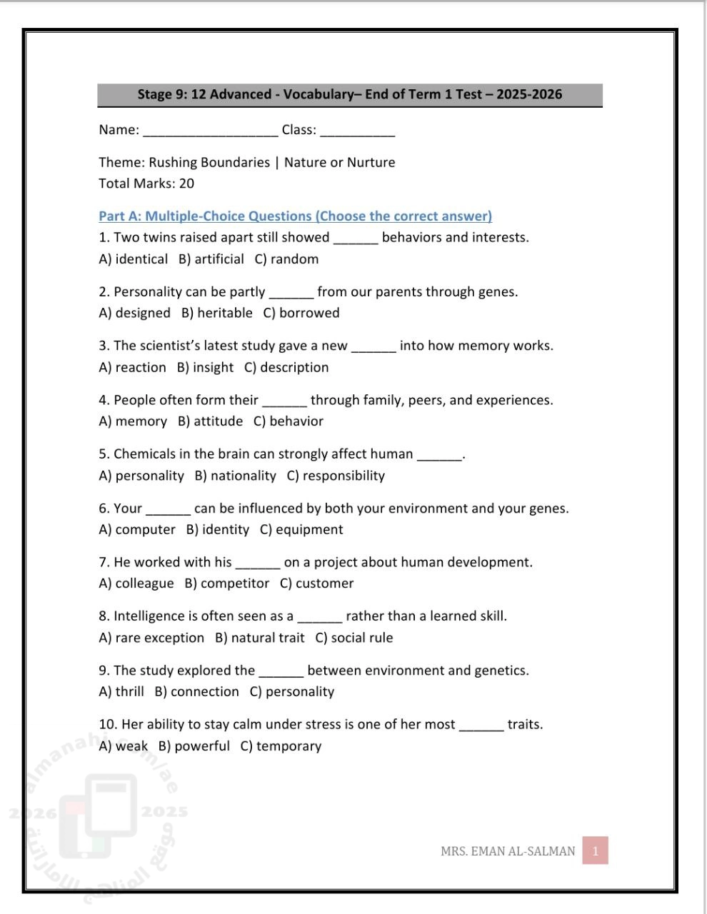 تم إيجاد الملف: أسئلة اختبار أول Vocabulary مفردات متبوع بالإجابات المسار المتقدم