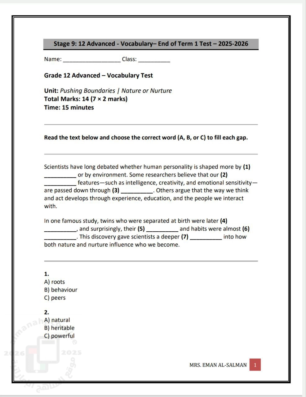 تم إيجاد الملف: أسئلة اختبار ثاني Vocabulary مفردات متبوع بالإجابات المسار المتقدم