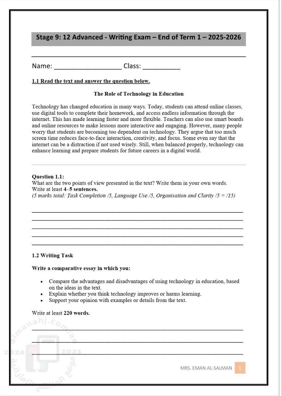 أسئلة اختبار Writing كتابة المسار المتقدم - إعداد: EMAN AL-SALMAN | ||