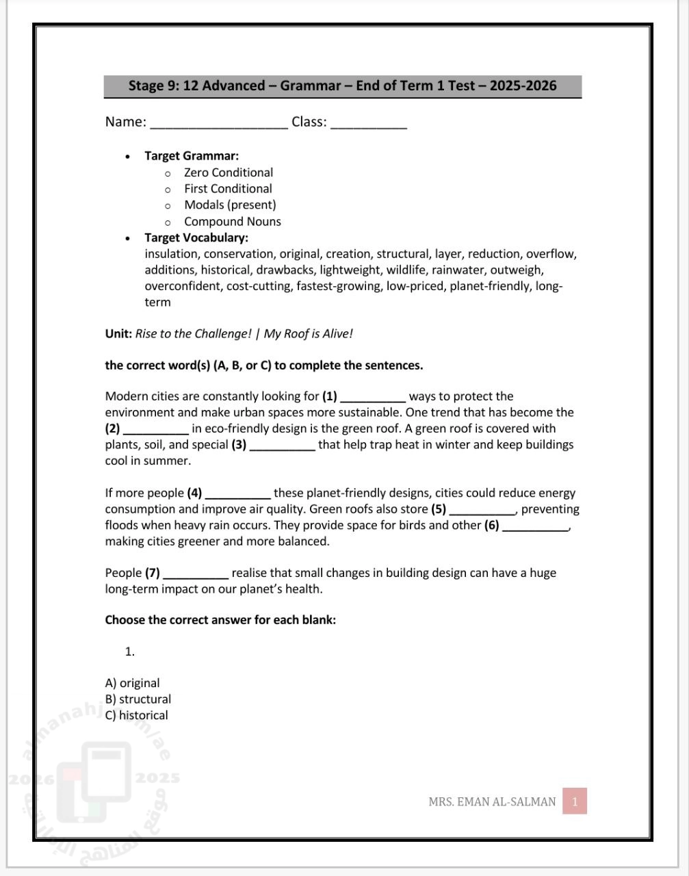 أسئلة اختبار Grammar قواعد متبوع بالإجابات المسار المتقدم - إعداد: EMAN AL-SALMAN | ||