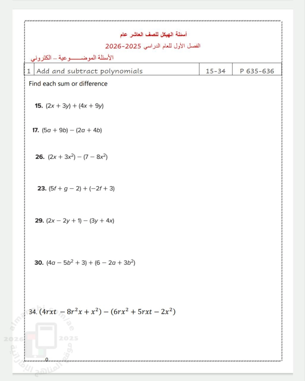 5. الصف العاشر المتقدم, رياضيات, تجميعة أسئلة وفق الهيكل الوزاري الجديد منهج ريفيل