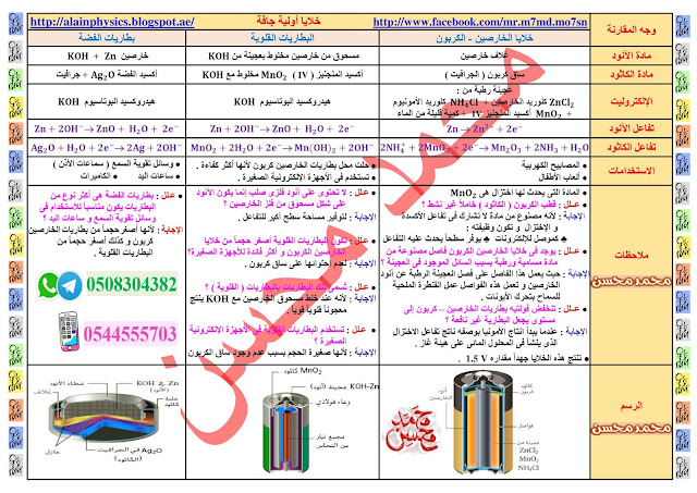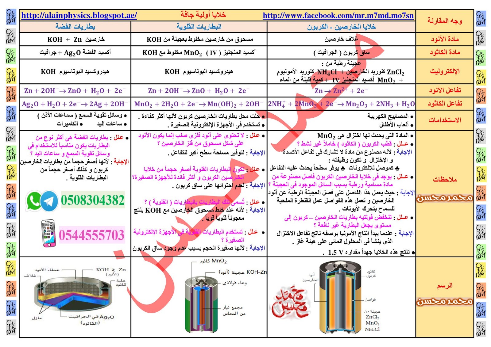 الصف الثاني عشر المتقدم, الفصل الثاني, كيمياء, 2017-2018, الكيمياء الكهربائية - ملخص البطاريات الأولية الجافة من إعداد المدرس محمد محسن يقدمه لكم موقع المناهج www.almanahj.com