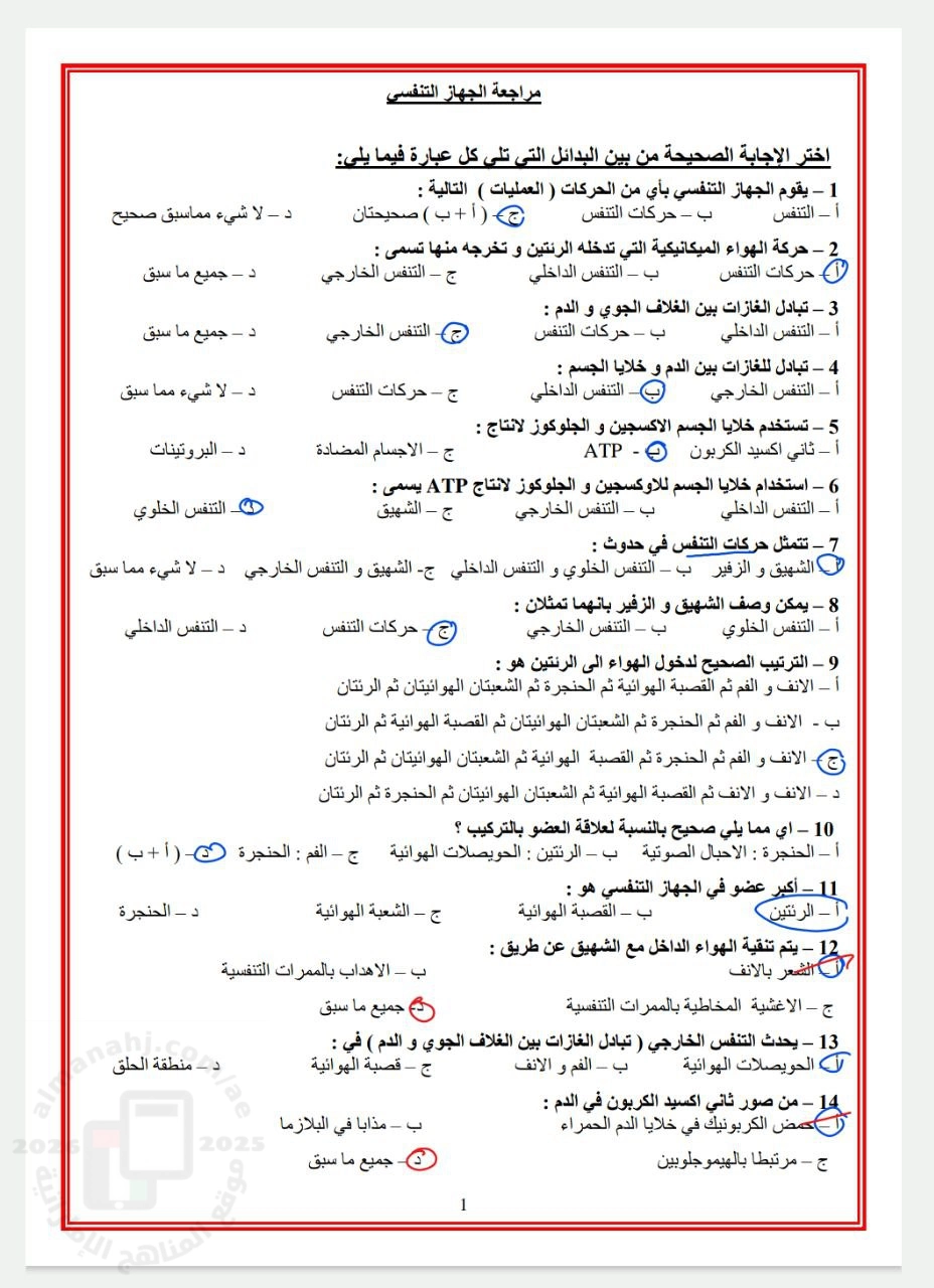 مراجعة درس الجهاز التنفسي متبوعة بالإجابات النموذجية | ||