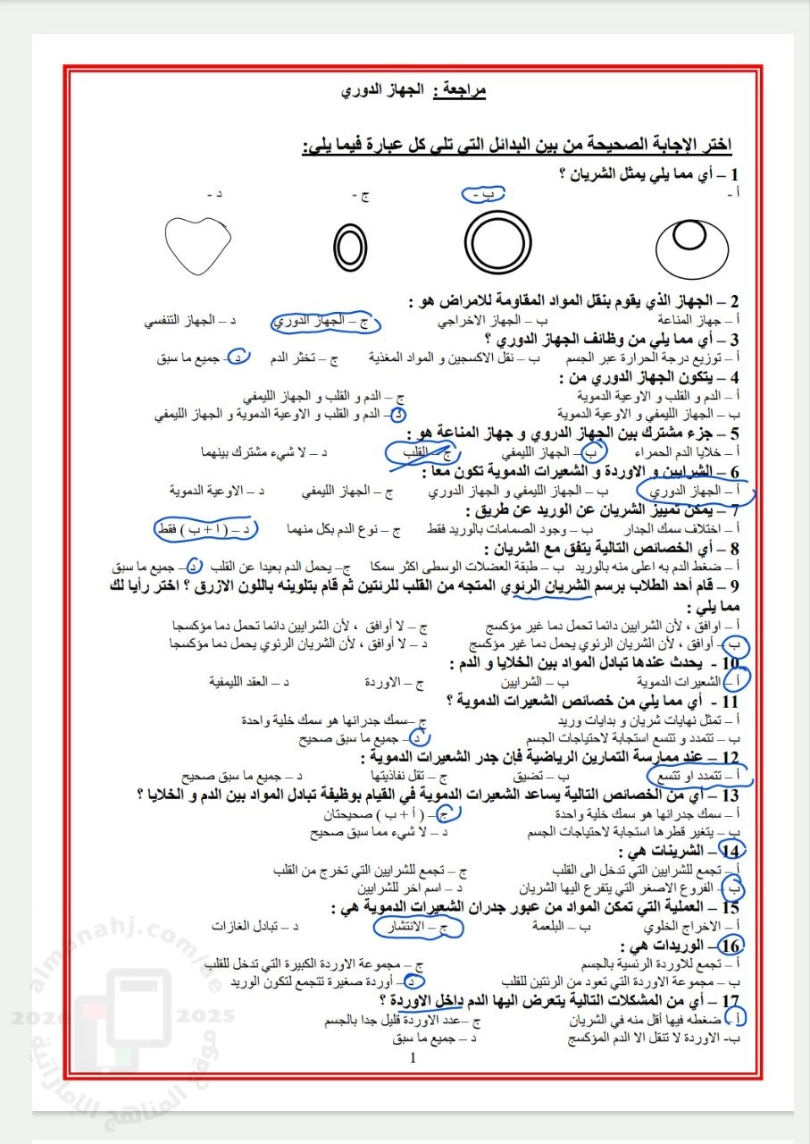 تم إيجاد الملف: مراجعة درس الجهاز الدوري متبوعة بالإجابات النموذجية