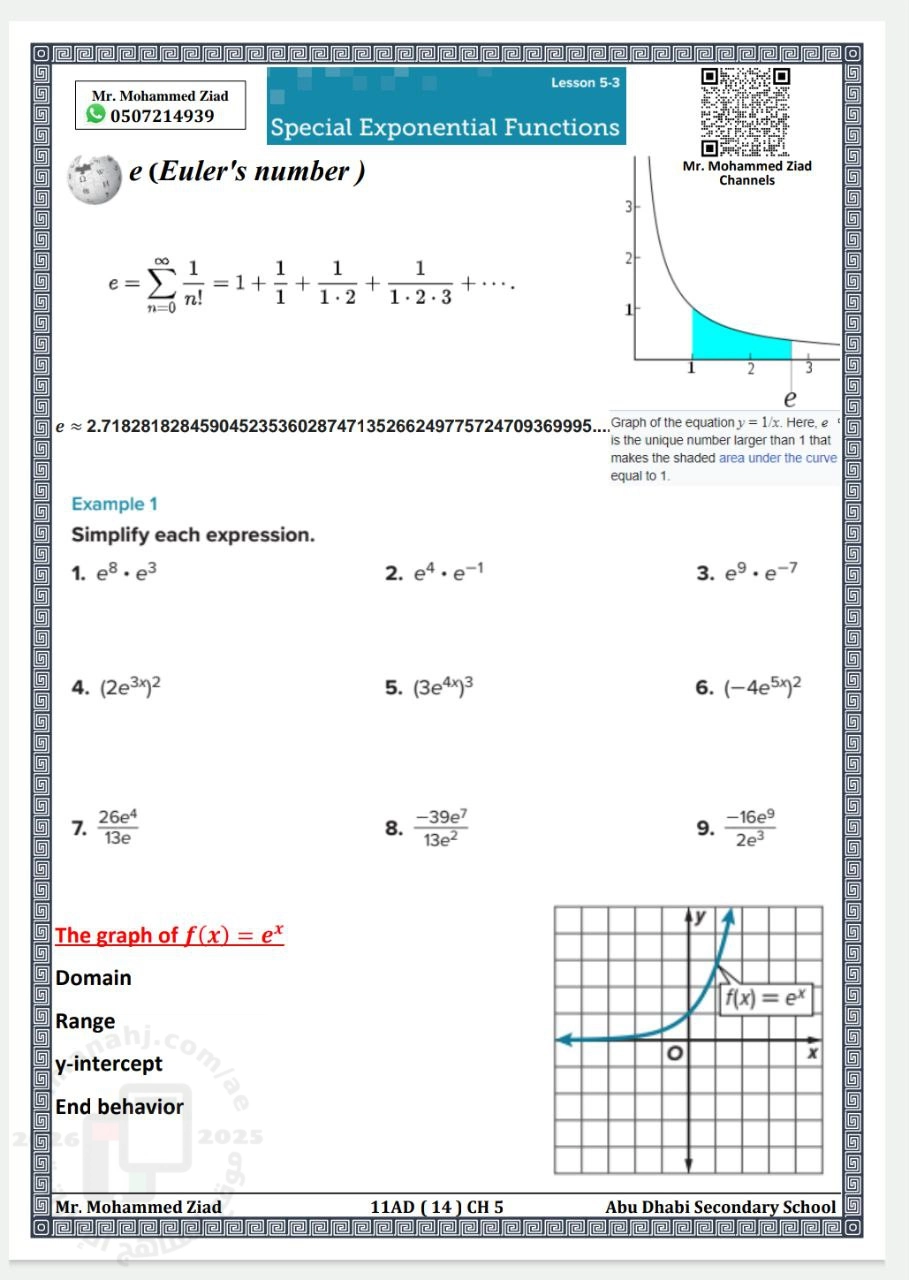 7. الصف الحادي عشر المتقدم, رياضيات, أوراق عمل الدرس الثالث Special Exponential Function من الوحدة الخامسة منهج ريفيل