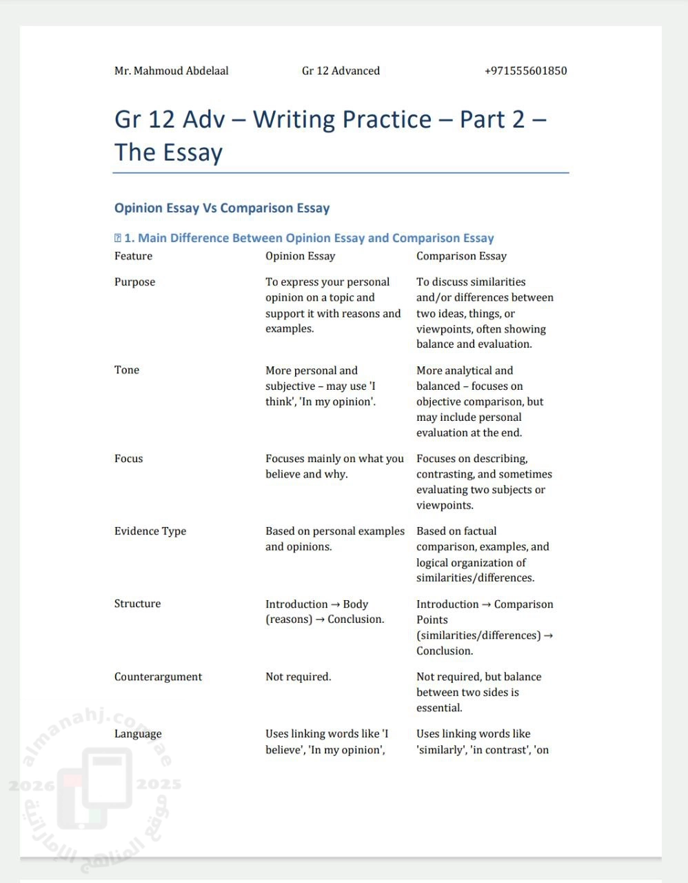 معلومات الملف: دليل كتابة مقالي الرأي والمقارنة للصف الثاني عشر | ||