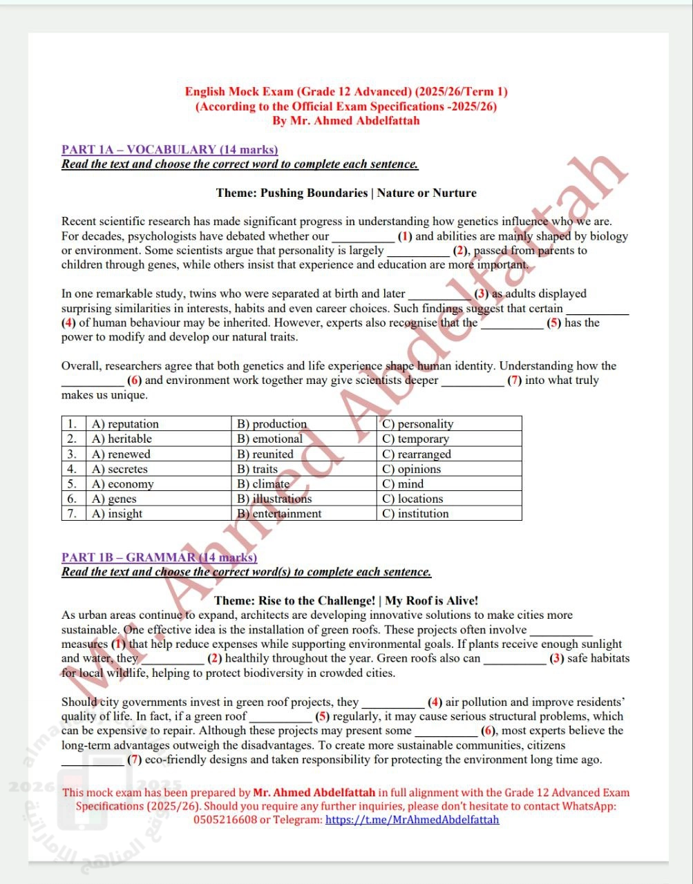 نموذج اختبار Mock Exam تجريبي وفق الهيكل الوزاري المسار المتقدم - إعداد: Ahmed abdelfattah | |||
