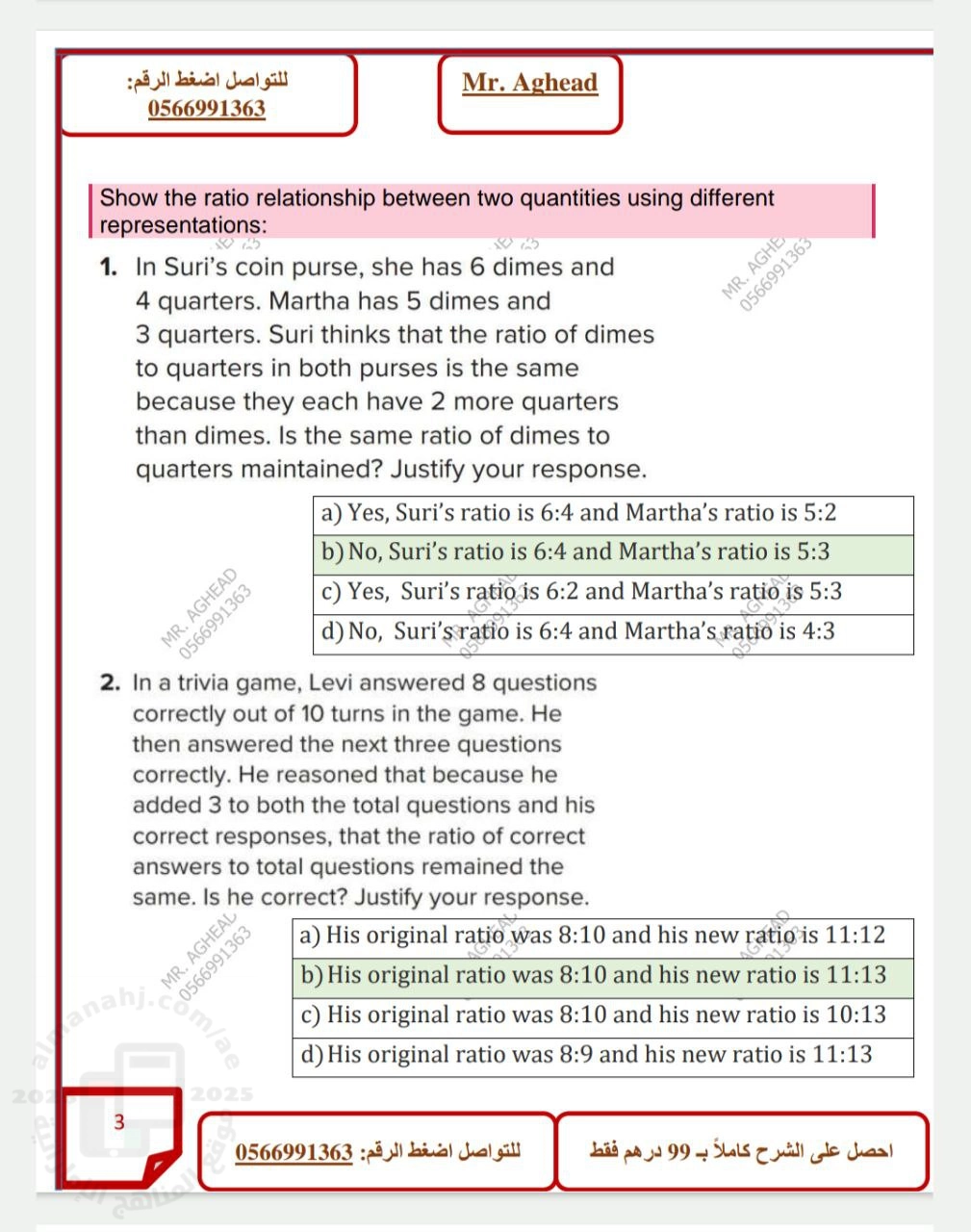 8. الصف السادس, رياضيات, نموذج إجابة تجميعة شاملة وفق كامل الهيكل الوزاري منهج ريفيل