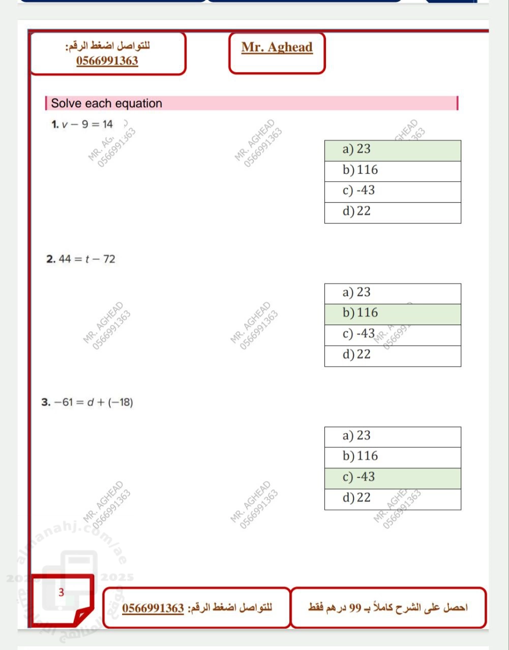 8. الصف التاسع العام, رياضيات, نموذج إجابة تجميعة شاملة وفق كامل الهيكل الوزاري منهج ريفيل