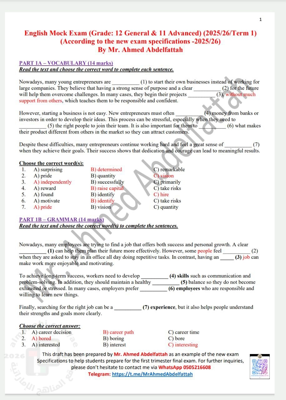حل نموذج اختبار Mock Exam تجريبي وفق الهيكل الوزاري المسار المتقدم - إعداد: Ahmed Abdelfattah | |||